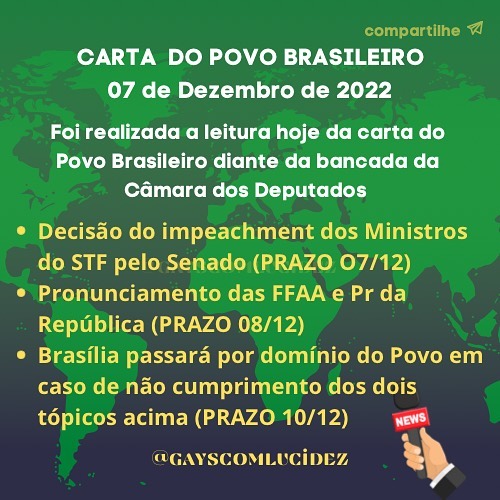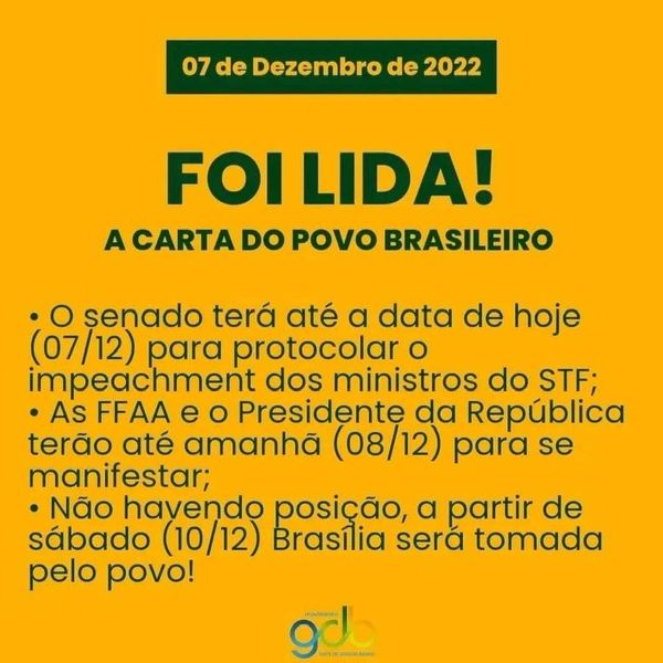 Em 7 de dezembro de 2022, cerca de cinquenta manifestantes vestindo camisetas pretas com a frase “Supremo é o povo” participaram da leitura da “Carta do Povo Brasileiro” no Congresso Nacional, em ato divulgado pela extrema-direita. Em tom de ultimato, a carta dava prazo até 8 de dezembro para que Jair Bolsonaro e as Forças Armadas interviessem nos Três Poderes, pedindo ainda a anulação das eleições de 2022 e a convocação de novo pleito com voto impresso. O texto, lido por Bismark Fugazza, pelo cacique Rony Parecis e por Maicon Sulivan, assessor do deputado Marcos Pollon, acusava o Supremo Tribunal Federal de autoritarismo e censura, alegava fraude eleitoral e exigia o impeachment dos ministros do STF.