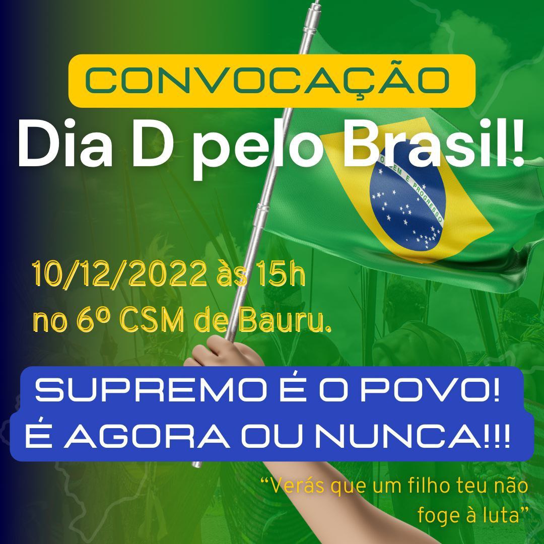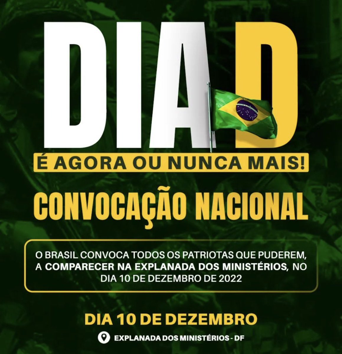Em 10 de dezembro de 2022, ocorreu na Esplanada dos Ministérios o ato intitulado “Dia D: É agora ou nunca mais”, convocado por Oswaldo Eustáquio e pelo grupo Hipócritas como a data anunciada para a “tomada de poder”. Apesar do tom de urgência e dos apelos por intervenção militar, a manifestação teve participação reduzida, com poucos militantes atendendo ao chamado. No local, um caminhão de som exibiu faixas questionando a legitimidade das eleições e pedindo ação das Forças Armadas, mas a mobilização revelou o enfraquecimento do movimento e as divergências estratégicas entre os diferentes núcleos acampados em Brasília.