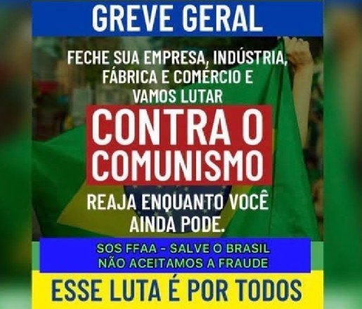 Em 7 de novembro de 2022, a extrema-direita convocou uma greve geral com o objetivo declarado de paralisar a economia nacional e pressionar por uma intervenção militar. Diferente de uma mobilização sindical tradicional, os discursos nas redes e nas ruas incentivavam um locaute, o fechamento de empresas por seus donos, em vez da adesão voluntária dos trabalhadores. A retórica dominante buscava normalizar o sacrifício econômico em nome de uma causa política, com a repetição da frase “a economia a gente vê depois”, ressignificando um lema associado ao enfrentamento da pandemia. No entanto, a tentativa de greve teve baixa adesão e revelou os limites organizativos do movimento, indicando a necessidade de reformulação tática entre seus articuladores.