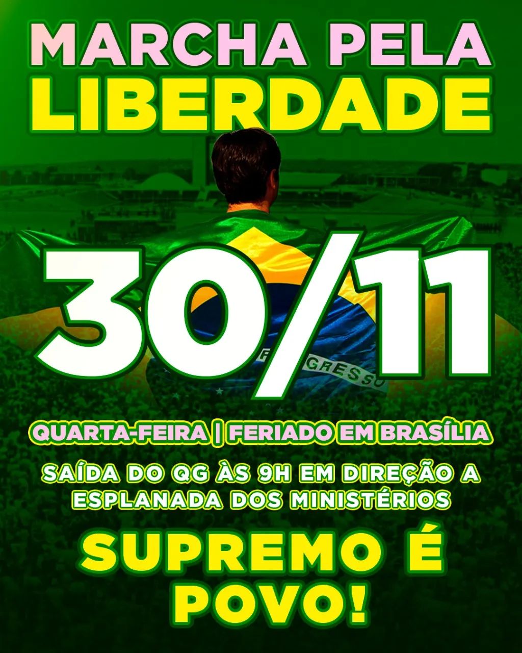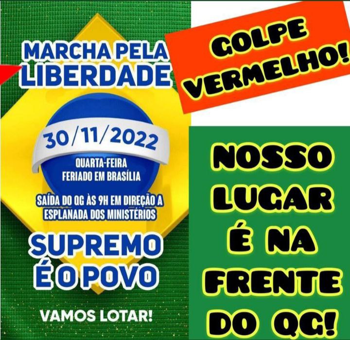 Em 30 de novembro de 2022, as mobilizações golpistas em Brasília entraram em uma nova fase. Pela primeira vez, os acampados na Praça dos Cristais, próximos ao Setor Militar Urbano, deslocaram-se cerca de sete quilômetros para realizar um ato na Esplanada dos Ministérios. A manifestação, intitulada “Marcha pela Liberdade”, reuniu centenas de pessoas em frente ao Congresso Nacional e contou com a presença de coletivos indígenas liderados por José Acácio Serere Xavante, o cacique Serere. Segundo a Polícia Federal, o protesto foi articulado por militares e organizado por lideranças digitais da extrema-direita, marcando um esforço de expansão simbólica e territorial do movimento, que até então permanecia restrito aos arredores dos quartéis.