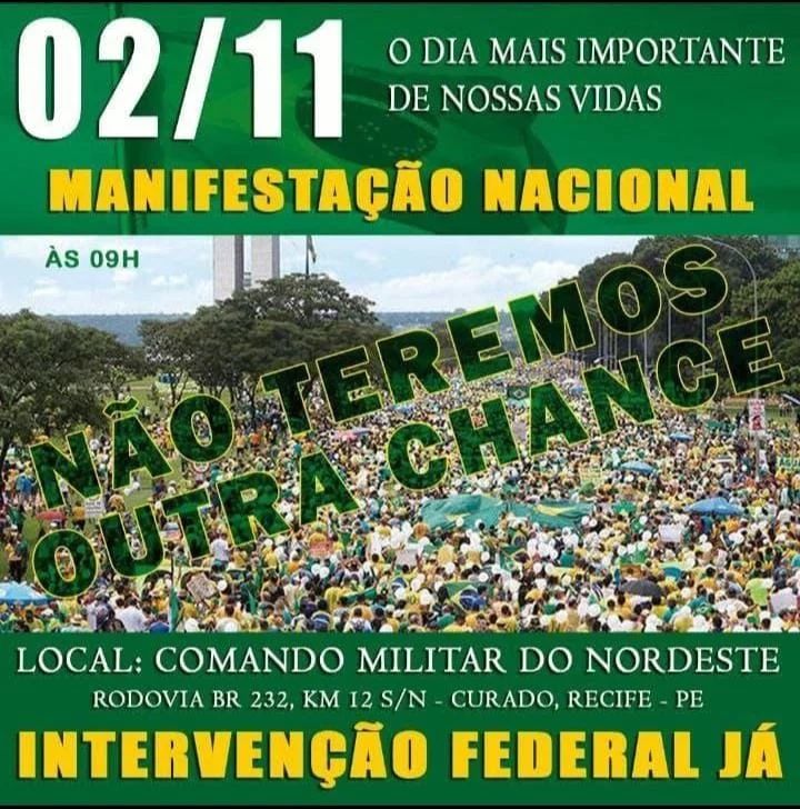 No feriado de Finados, em 2 de novembro de 2022, atos coordenados em pelo menos 24 estados brasileiros consolidaram a estratégia da extrema-direita em defesa aberta da ruptura institucional. As manifestações ocorreram de forma unificada em frente a quartéis-generais e comandos do Exército, acompanhadas por convocatórias para acampamentos permanentes nesses locais. Parlamentares bolsonaristas endossaram os protestos e incentivaram a pressão direta sobre os militares para que interviessem contra o resultado das eleições. A data representa um ponto de inflexão: foi a primeira vez em que a extrema-direita, de maneira articulada e nacionalizada, ocupou simultaneamente espaços simbólicos do poder militar, alinhando os núcleos digitalizados e as alas mais tradicionalmente militaristas do movimento.